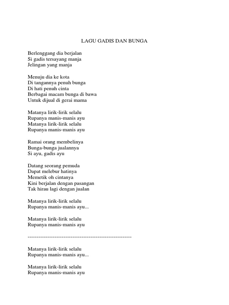 Skip to main content. Menuju dia ke kota Di tangannya penuh bunga Di hati penuh cinta Berbagai macam bunga dibawa. Ramai orang membelinya Bunga-bunga jualannya Si ayu gadis ayu.